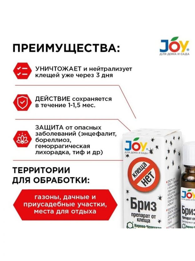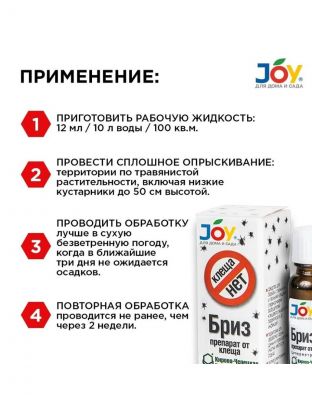 Способ применения: сплошное опрыскивание территории по травянистой растительности, включая низкие кустарники до 50 см высотой. Полное уничтожение клещей через 3 дня. Повторная обработка не ранее, чем через 2 недели.