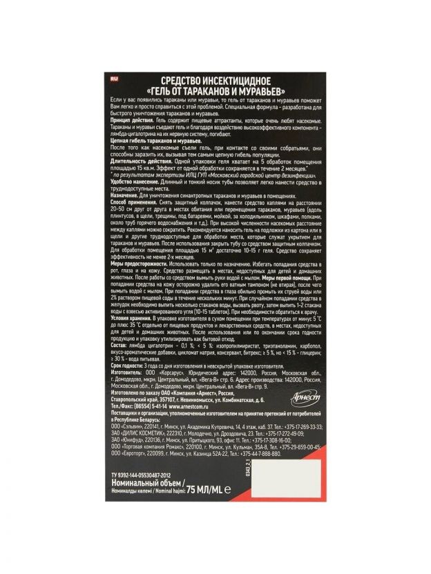 • Состав: лямбда-цигалотрин; изопропилмиристат; триэтаноламин; вкусо-ароматические добавки; цикломат натрия; консервант; битрекс; глицерин; вода питевая.
