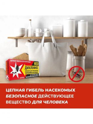 Дихлофос Нео Приманка от тараканов и муравьев. Полноценный спектр ядов эффективен против всех ползающих насекомых: тараканов, клопов, муравьев. Максимальное удобство в использовании: не оставляет следов на поверхностях. Обеспечивает длительную защиту: одной ловушки хватает на два месяца работы. Надежная защита: создает цепную реакцию гибели всех насекомых в популяции. Приманка содержит специальные вещества, которые при попадании в организм насекомых воздействуют на их нервную систему. Действующее вещество безопасно для человека.