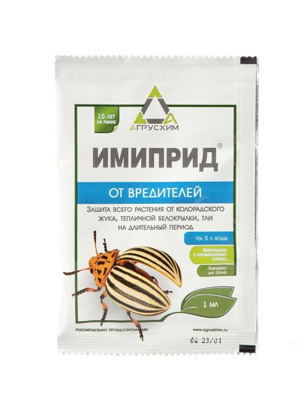 Инсектицид Имиприд от бренда Агрусхим — эффективное средство для защиты картофеля, томатов и огурцов от вредителей. Жидкая форма в удобной ампуле объемом 1 мл обеспечивает простоту применения и экономичный расход. Высокая дождеустойчивость гарантирует надежную защиту даже при неблагоприятных погодных условиях. Средство разрешено к использованию в теплицах, подходит для борьбы с колорадским жуком, белокрылкой и тлей.