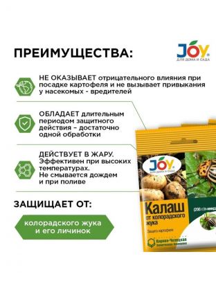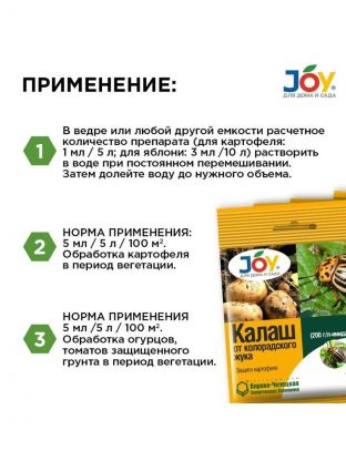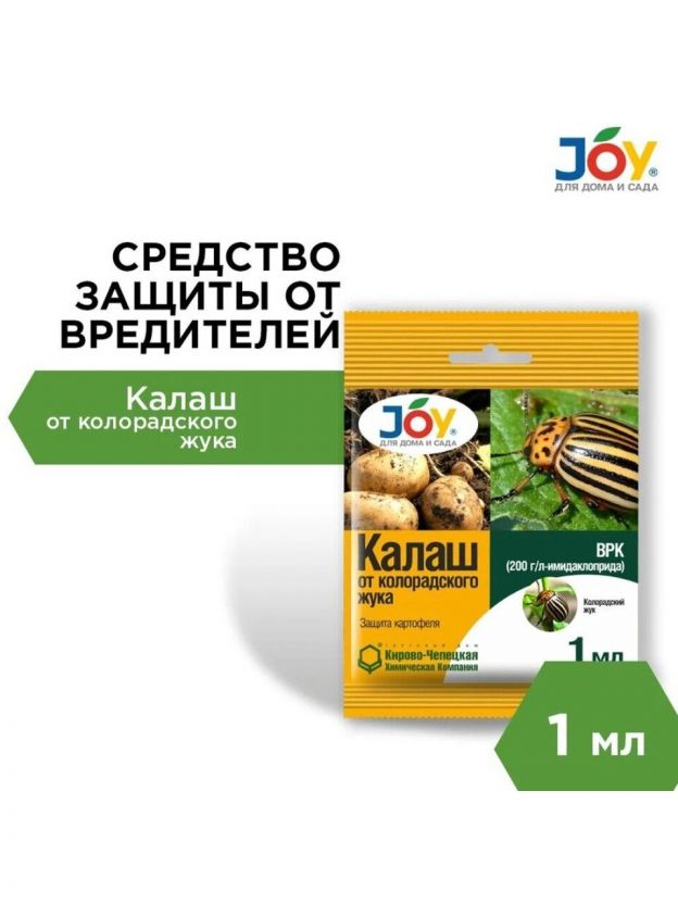 Эффективное средство JOY "Калаш" быстро и надежно уничтожает колорадского жука и его личинки. Действует даже в жару.