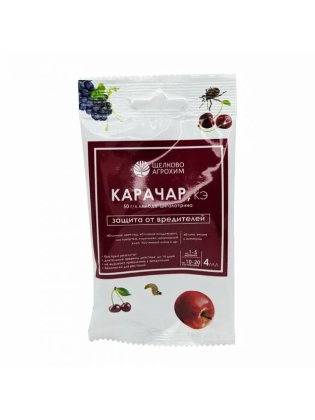 Инсектицид Карачар контактно-кишечного действия против различных групп насекомых-вредителей на плодово-ягодных культурах. Препарат действует на нервную систему насекомых, нарушает проницаемость клеточных мембран, блокирует натриевые каналы.