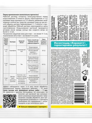 В отличие от аналогов, Каракат действует не только против колорадского жука, но и справляется с тлей, листовертками и оленкой мохнатой. Это позволяет решить сразу несколько проблем за одну обработку. Если вы ищете, какой инсектицид лучше для картофеля, обратите внимание на Каракат: он безопасен при соблюдении норм, не вызывает ожогов растений, а эффект длится до 21 дня. Продукт сертифицирован и рекомендован для использования на приусадебных участках.