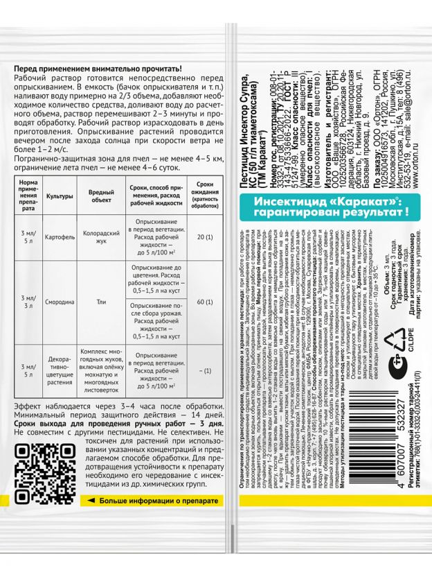 Инсектицид Каракат от бренда Ортон — современное средство для борьбы с основными вредителями картофеля и садовых растений. Порошковая форма быстро растворяется, обеспечивая равномерное покрытие листвы и максимальный результат. Благодаря точной дозировке Каракат удобен для обработки как небольших, так и средних участков. Многие спрашивают: «Как использовать инсектицид Каракат на даче?» — просто разведите содержимое в воде по инструкции и опрыскайте растения.
