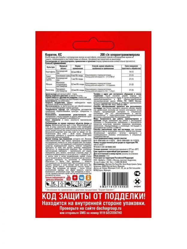 Инсектицид Кораген от Expert Garden — надежное средство в борьбе с колорадским жуком. Эта жидкость объемом 2 мл предназначена для эффективного опрыскивания растений, обеспечивая защиту от вредителей. Продукт произведен в России и идеально подходит для использования на дачных участках и в садах.