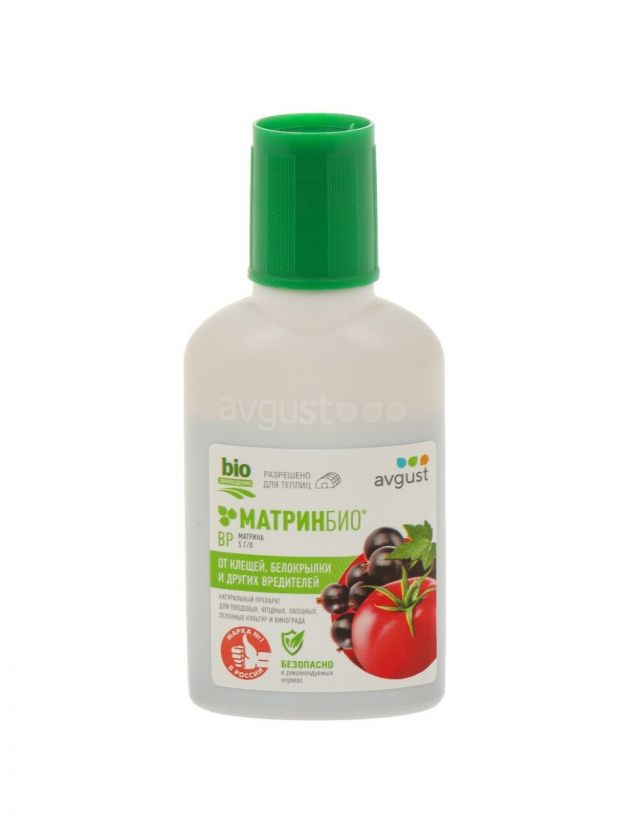 МатринБио - уникальный на российском рынке биопрепарат для защиты овощных, плодовых культур и винограда от широкого спектра вредителей. Высокоэффективен против клещей, тепличной белокрылки, тли, трипсов, цикадок, совок, гроздевой листовертки и прочих.
