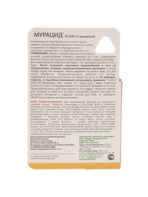 Эффективное решение для борьбы с муравьями - инсектицид Мурацид от бренда "Зеленая аптека Садовода". Это мощное средство в жидкой форме объемом 10 мл, специально разработанное для уничтожения муравьев. Продукт производится в России и предназначен для полива, что обеспечивает простоту в использовании и высокую результативность.