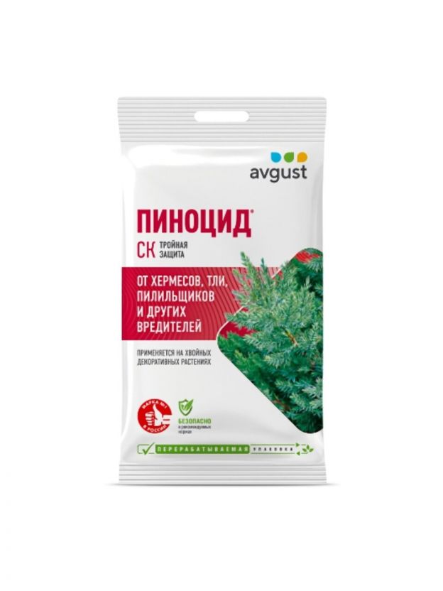 Средство для защиты хвойных растений от вредителей «Пиноцид» оказывает комплексное действие. Препарат эффективен в борьбе со щитовками, тлей, хермесами и другими распространенными вредителями. Перед использованием 2 мл (одну ампулу) инсектицида нужно растворить в 10 л воды. Срок защиты — до 14 дней.