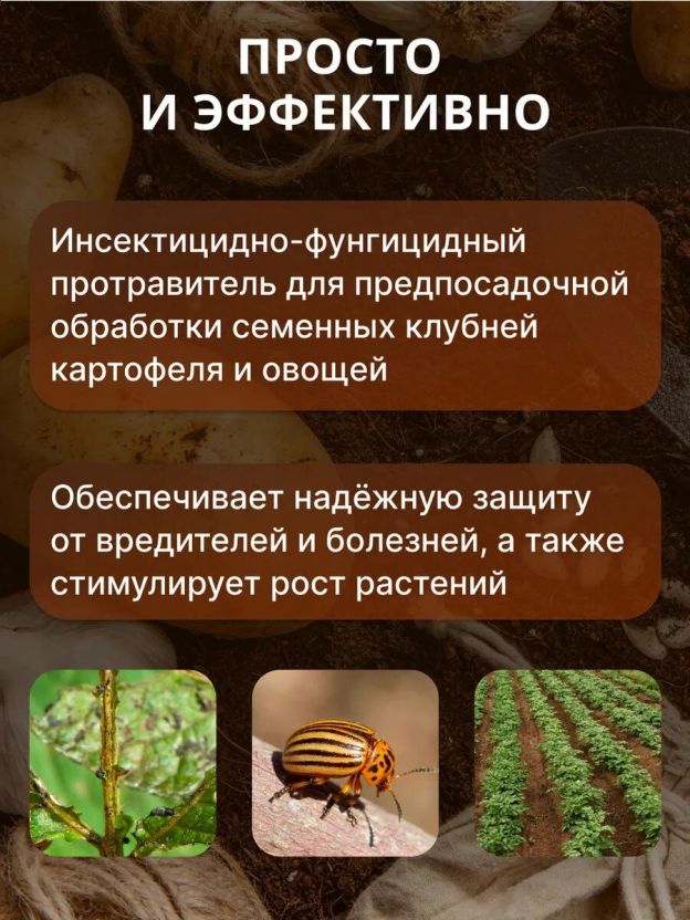 Инсекто-фунгицидный протравитель семенных клубней картофеля, семян овощных культур против грызущих и сосущих вредителей (в т.ч. почвообитающих) и заболеваний всходов.