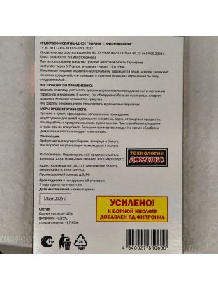 • Состав: борная кислота - 12%, фипронил – 0.05%, техкомпоненты – 87.95%.