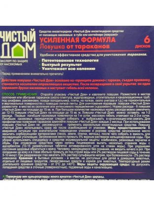 Применение: откройте упаковку «Чистый Дом» и извлеките ловушки. Разместите в местах скопления или обитания тараканов (около плинтуса, водопроводных, отопительных и канализационных труб, под шкафами, раковинами, позади холодильника, плиты, на полках, около унитаза и т.д.) на горизонтальных и вертикальных поверхностях с помощью липкой ленты. Для уничтожения муравьев разместите ловушки в местах их скопления или интенсивного передвижения («дорожки»). Норма расхода – 6 ловушек на площади до 15 кв. м. При большом количестве насекомых норму расхода можно увеличить до 12-15 ловушек на площади до 15 кв. м. Ловушки можно оставить на 1-2 месяца. Первые погибшие насекомые появляются на 1-е сутки, массовую гибель отмечают на 2-3-и сутки. Для профилактики появления тараканов заменяйте ловушки каждые 2 месяца. При использовании ловушек «Чистый Дом» не рекомендуется применять аэрозольные инсектицидные средства. Ловушку «Чистый Дом» использовать сразу же после вскрытия упаковки.