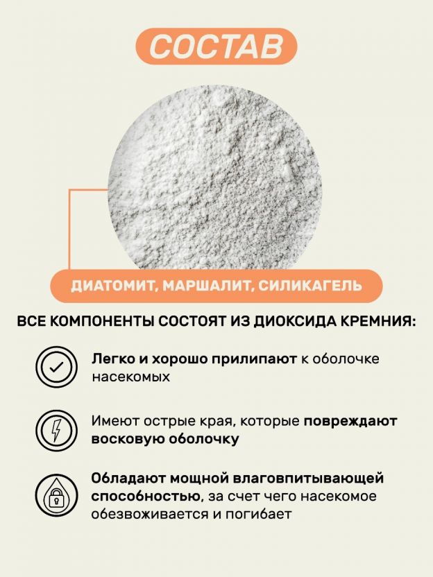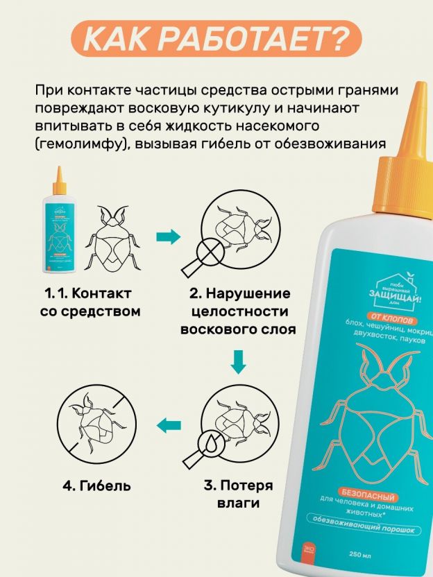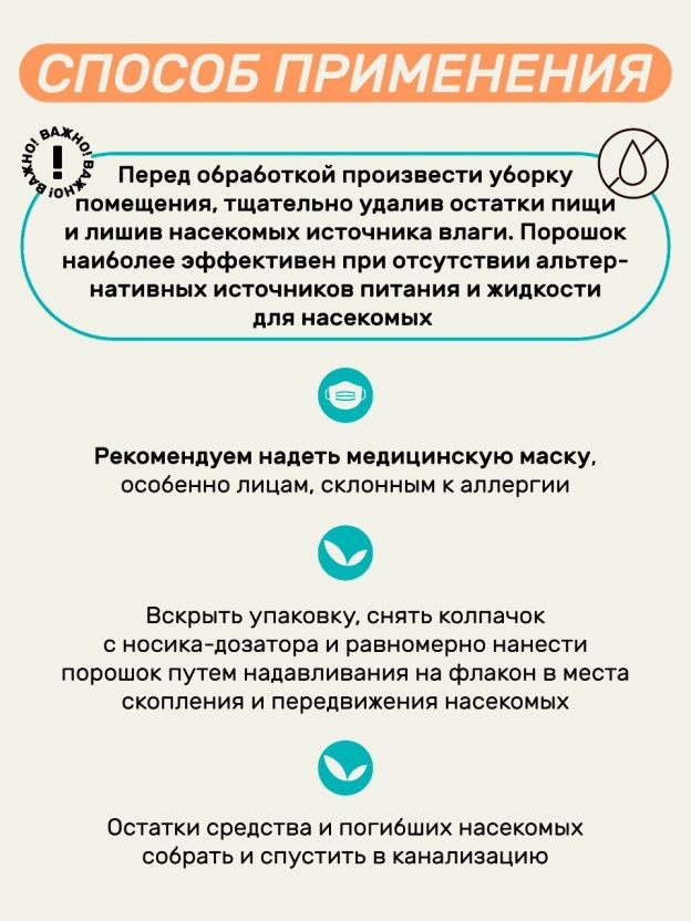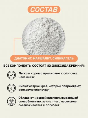 • Удобный формат порошка во флаконе 250 мл — хватает на обработку до 50 м2, легко дозировать и применять