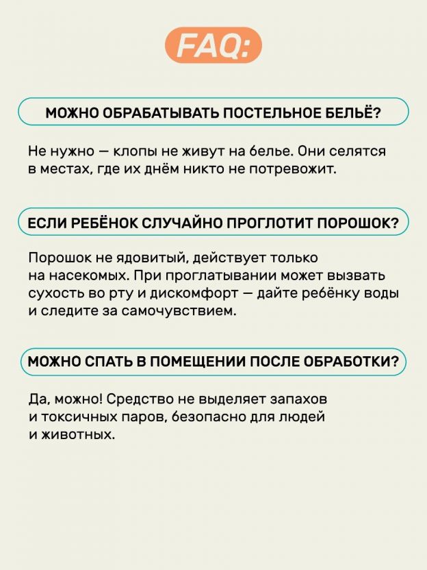 Порошок не содержит агрессивных запахов и не требует проветривания, однако рекомендуется избегать прямого контакта с обработанными участками до уборки.