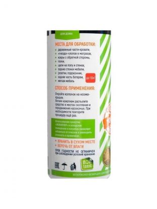 Препарат необходимо рассыпать в местах, где были замечены вредители - радиатор, ковры, плинтус, все щели и полки, под кроватью, в матрасах, каркас кровати. В течении суток не проводить уборку помещения. При необходимости повторить обработку.