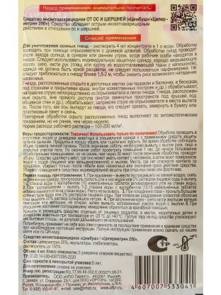 Разведите 2 мл концентрата в воде по инструкции, обработайте места скопления ос на растениях или в помещениях. Одного флакона хватает на обработку стандартного участка.