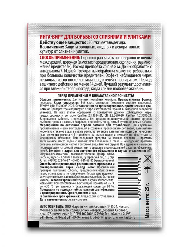 Инта-вир от слизней и улиток, порошок 25 г — эффективная защита растений за 1 применение: избавьтесь от вредителей быстро и без лишних затрат.