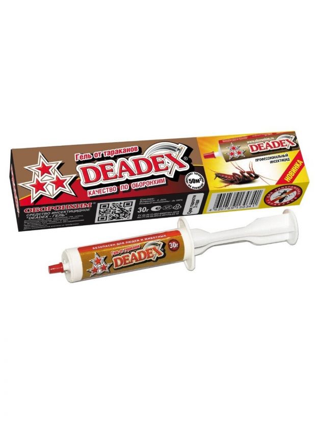 Инсектицид Deadex предназначен для уничтожения всех видов тараканов в жилых помещениях и др. объектах жизнедеятельности человека. Наносится каплями в местах обитания и передвижения насекомых, 100 % гибель насекомых наступает на 2-3 сутки. Расфасовка препарата в шприцы очень удобна для применения. Данный препарат является одним из наиболее эффективных и распространённых средств борьбы с тараканами в нашей стране и некоторых странах ближнего зарубежья.
