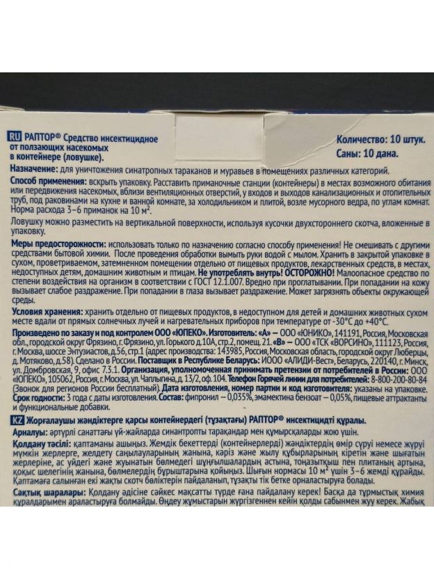 Инсектицид Раптор - это эффективное и удобное средство для борьбы с тараканами в вашем доме. Комплект включает 10 ловушек, которые помещены в специальный контейнер для удобства хранения и использования.