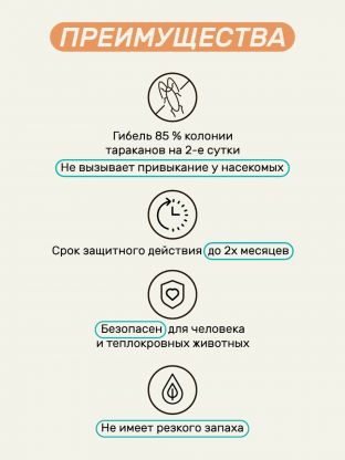 • Двойное действие — эффективен против тараканов и муравьев, минимизирует повторное появление