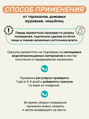 Рассыпьте гранулы из тубуса в местах скопления насекомых: вдоль плинтусов, под мебелью, у мусорных ведер. Не смывайте и не убирайте средство до исчезновения вредителей.