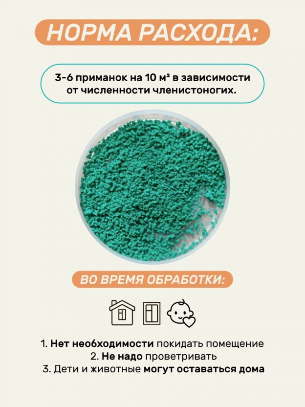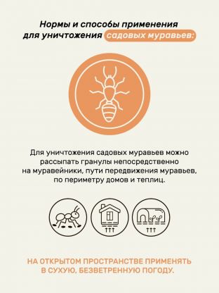 В тубусе 200 г гранул, этого достаточно для обработки до 40 м2 площади. При необходимости обработку можно повторить через 2-3 недели.