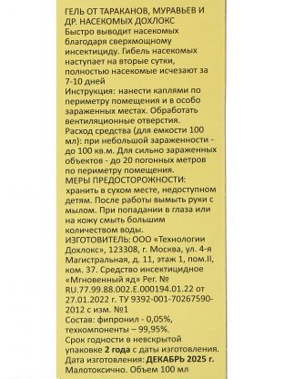 Инсектицид-гель Дохлокс 100 мл — эффективное и быстрое решение для уничтожения тараканов в доме и на даче. Без запаха, действует до 2 месяцев.