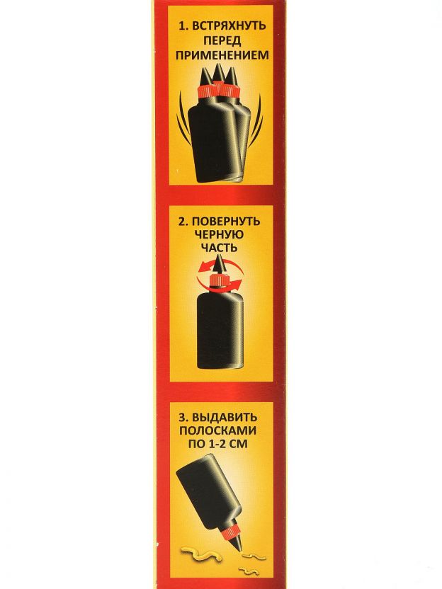 Нанесите гель точечно полосками длиной 2-3 см с интервалом 2-3 см в местах скопления тараканов: вдоль плинтусов, под раковиной, за техникой. Не смывайте и не вытирайте средство минимум 2 недели для максимального эффекта.