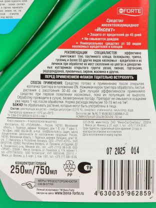 Инсектицид от тли, паутинных клещей и других насекомых, спрей, 750 мл, концентрат 250 мл, Bona Forte