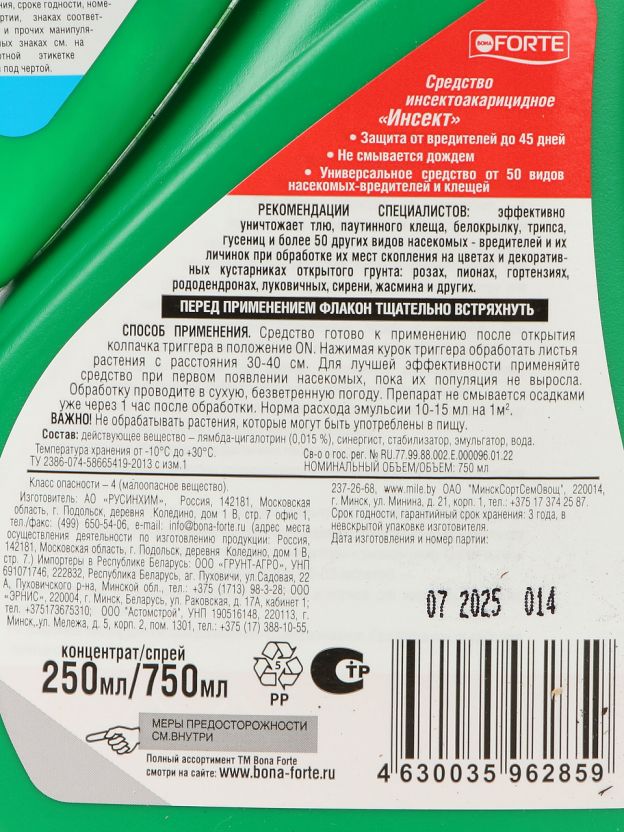 Эффективный инсектицид-спрей Bona Forte 750 мл: быстро избавьтесь от тли, паутинных клещей и других вредителей — защита растений без хлопот.