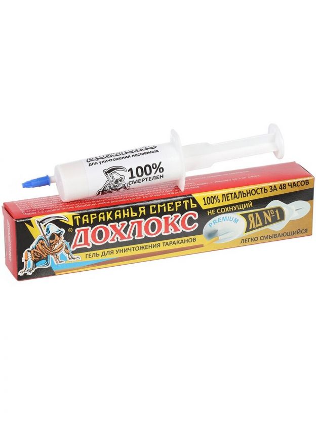 Современное средство от тараканов Дохлокс Яд №1. В состав входят специальные компоненты, которые не дают гелю сохнуть, тем самым существенно повышая его эффективность и продлевая сроки активного действия. Гель не присыхает к полу, сохраняет пластичность, не окаменевает и легко смывается с поверхности в случае необходимости.