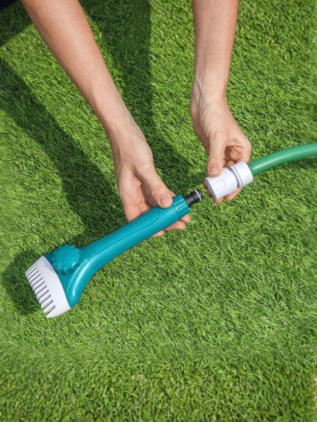 • легко подключается к садовому шлангу через быстроразъемный клапан: простота использования без лишних инструментов и сложных манипуляций;