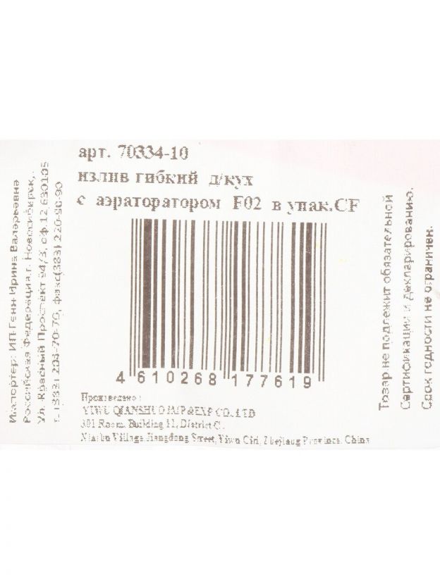 Излив смесителя для кухни, нержавеющая сталь, ИМП, гибкий излив, 1 режим, индивидуальная упаковка, ComfortFactor, 70334-10