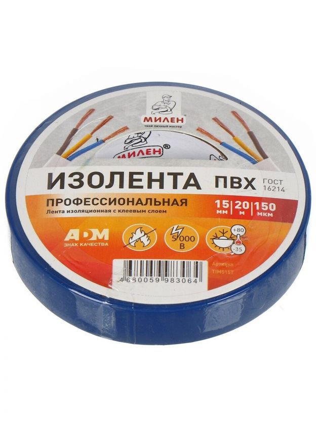 Изолента ПВХ, 15 мм, 150 мкм, синяя, 20 м, Милен, ТIM515T