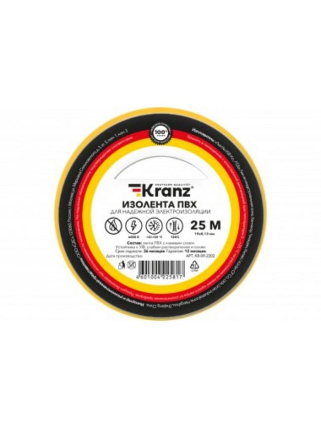 Изолента ПВХ, 19 мм, 130 мкм, желтая, 25 м, Kranz, KR-09-2202