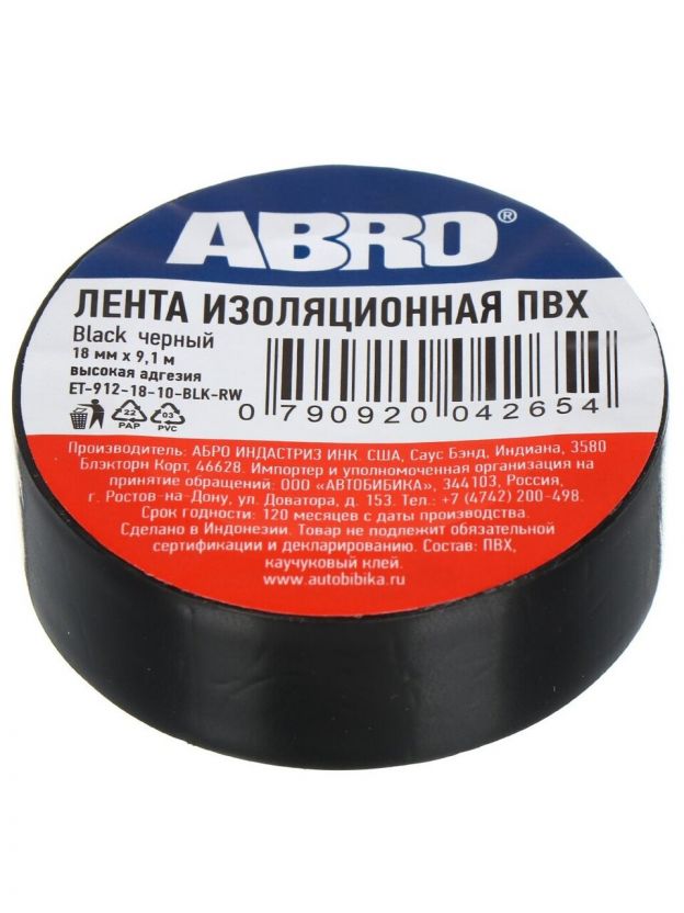 Изолента Abro - это высококачественная изоляционная лента, изготовленная из ПВХ (поливинилхлорида). Лента обладает высокой адгезией и устойчивостью к истиранию, что гарантирует её долговечность и надёжность при использовании.