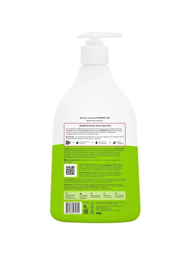Экомыло детское Wonder Lab с ароматом фруктового лимонада — безопасная забота о коже малыша, большой объём 540 мл, экономия для всей семьи.