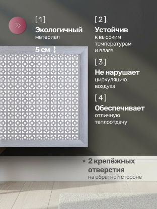 Декоративный экран изготовлен из МДФ, который не содержит вредных для здоровья веществ. Это особенно важно для людей с аллергией или семей с маленькими детьми. Обладает высокой устойчивостью к механическим повреждениям, влаге и высоким температурам, что обеспечивает его долговечность.