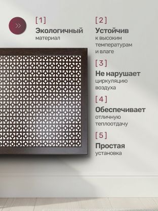 Декоративный экран не только украшает интерьер, но и способствует равномерному распределению тепла, сохраняя при этом функциональность радиатора. Материал МДФ — экологически безопасный, устойчивый к износу и прост в уходе, что гарантирует долгий срок службы. Модель DE LUXE Дамаско выполнена в актуальном стиле, что делает её удачным выбором для ценителей практичности и эстетики.