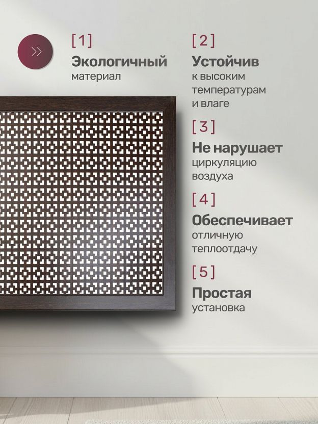 Экран для радиатора из МДФ 600х600 мм венге DE LUXE Дамаско от бренда Стильный дом — стильное решение для создания уюта и гармонии в современном интерьере. Эффективно скрывает радиатор отопления, придавая комнате завершённый и элегантный вид. Благодаря универсальному размеру и насыщенному цвету венге, экран органично впишется в большинство жилых и офисных пространств, подчеркнув индивидуальность помещения.