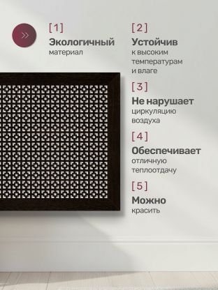 Декоративный экран изготовлен из МДФ, который не содержит вредных для здоровья веществ. Это особенно важно для людей с аллергией или семей с маленькими детьми. Обладает высокой устойчивостью к механическим повреждениям, влаге и высоким температурам, что обеспечивает его долговечность.