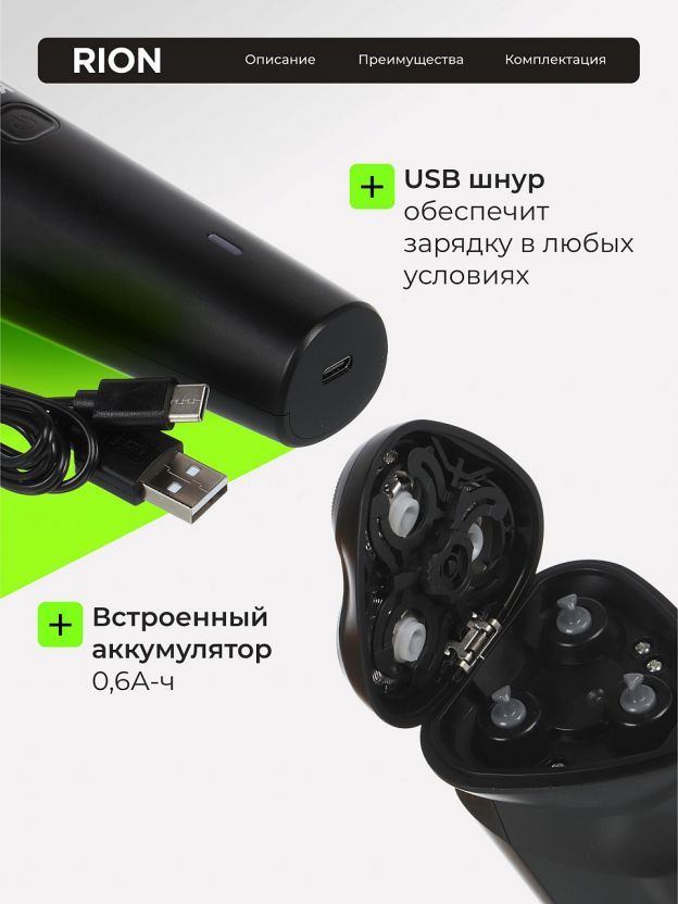 Электробритва аккумуляторная, Rion, DC5V, 0.6 А.ч, 3 бритвенные головки, выдвижной триммер,1 А, USB TYPE C, черная, RSM-2168