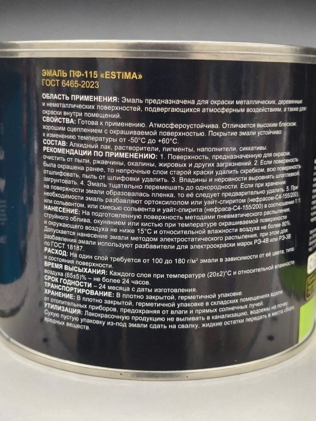 Покупка эмали Estima ПФ-115 - это инвестиция в будущее. Она обеспечивает надежную защиту и привлекательный внешний вид ваших объектов, что позволяет экономить на частых перекрасках и ремонтах. Использование уайт-спирита или сольвента в качестве разбавителя делает процесс нанесения максимально удобным и простым. Выбирайте качество и надежность с эмалью Estima, и наслаждайтесь результатом долгие годы.