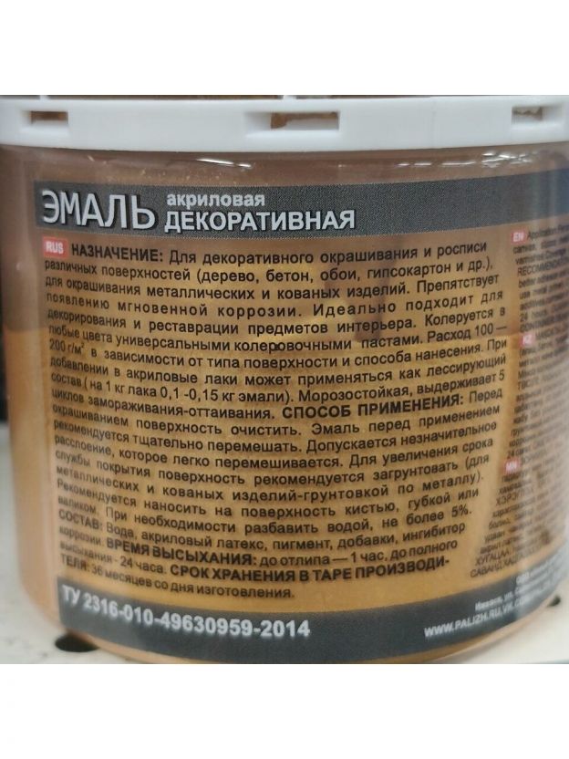 Акриловая эмаль Palizh предназначена для покраски и росписи поверхностей из дерева, обоев, бетона, гипсокартона, металла, в том числе кованных предметов. Средство может использоваться как снаружи, так и внутри помещений.