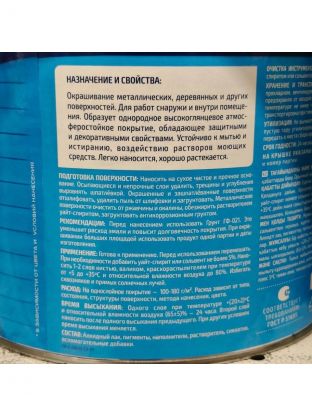 Универсальная алкидная высокоглянцевая эмаль. Имеет высокий уровень атмосферостойкости. Имеет широчайшую гамму из 32 стойких и насыщенных цветов на самого взыскательного покупателя. Лёгкая в работе. Имеет износостойкое глянцевое покрытие и хорошую укрывистость.
