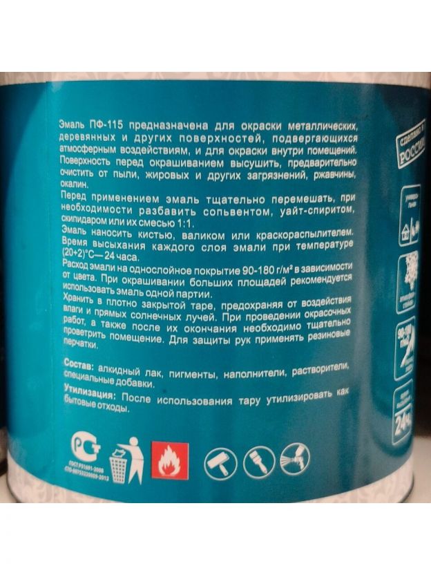 Эмаль ПФ-115 предназначена для окраски металлических, деревянных и других поверхностей, подвергающихся атмосферным воздействиям, и для окраски внутри помещений. Поверхность перед окрашиванием высушить, предварительно очистить от пыли, жировых и других загрязнений, ржавчины окалин.