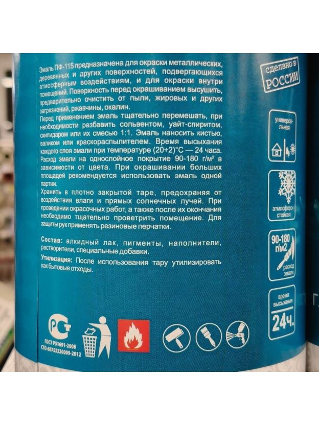 Эмаль ПФ-115 предназначена для окраски металлических, деревянных и других поверхностей, подвергающихся атмосферным воздействиям, и для окраски внутри помещений. Поверхность перед окрашиванием высушить, предварительно очистить от пыли, жировых и других загрязнений, ржавчины окалин.