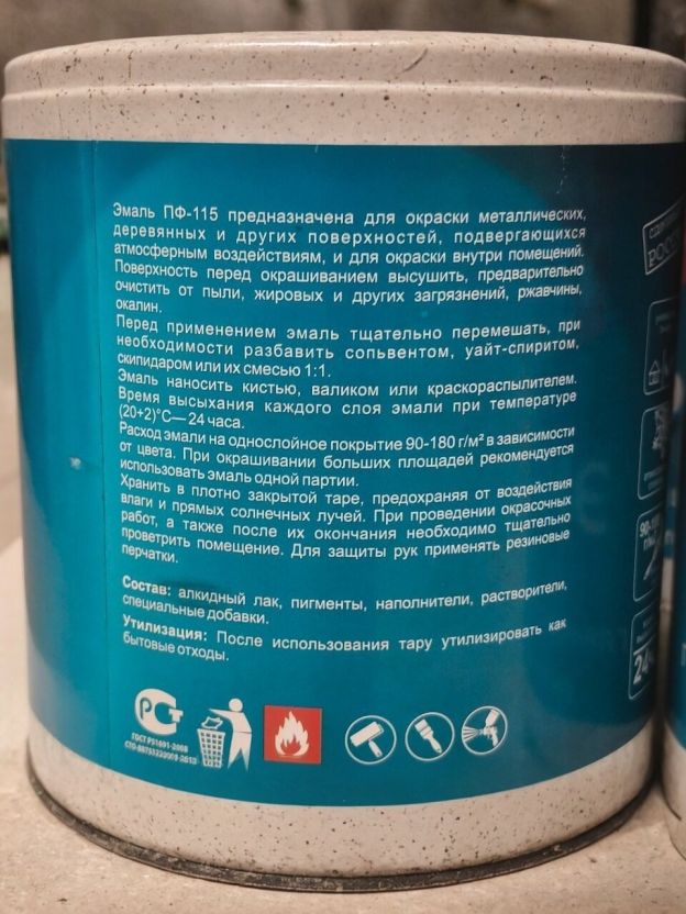Эмаль ПФ-115 предназначена для окраски металлических, деревянных и других поверхностей, подвергающихся атмосферным воздействиям, и для окраски внутри помещений. Поверхность перед окрашиванием высушить, предварительно очистить от пыли, жировых и других загрязнений, ржавчины окалин.