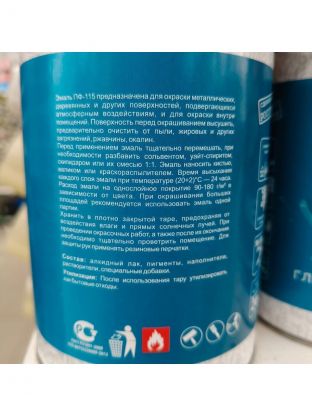 Эмаль ПФ-115 предназначена для окраски металлических, деревянных и других поверхностей, подвергающихся атмосферным воздействиям, и для окраски внутри помещений. Поверхность перед окрашиванием высушить, предварительно очистить от пыли, жировых и других загрязнений, ржавчины окалин.