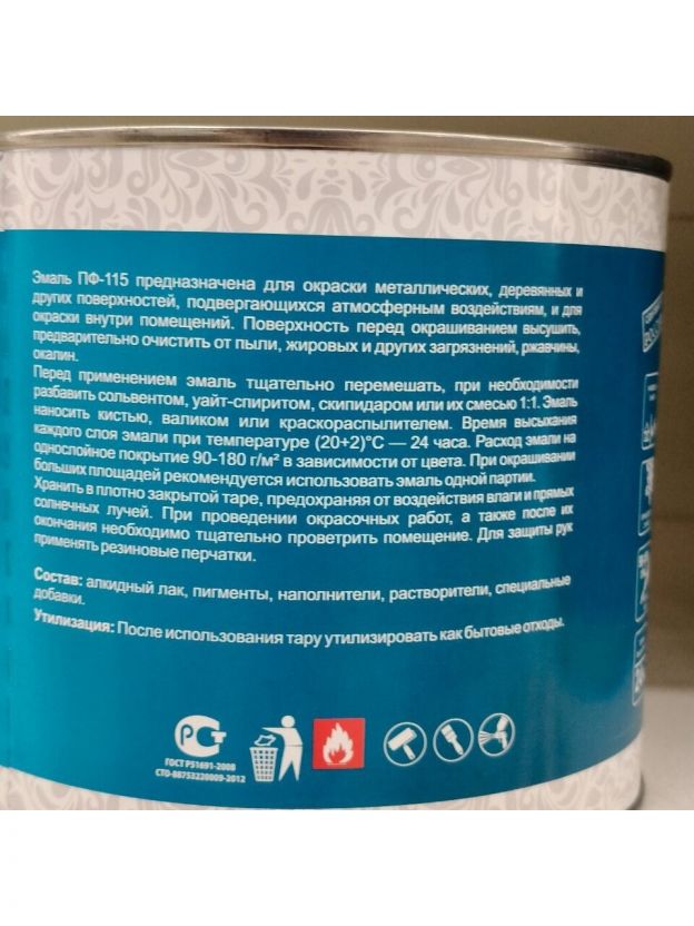 Эмаль ПФ-115 предназначена для окраски металлических, деревянных и других поверхностей, подвергающихся атмосферным воздействиям, и для окраски внутри помещений. Поверхность перед окрашиванием высушить, предварительно очистить от пыли, жировых и других загрязнений, ржавчины окалин.