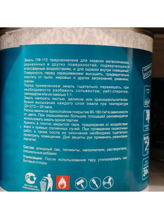 Эмаль ПФ-115 предназначена для окраски металлических, деревянных и других поверхностей, подвергающихся атмосферным воздействиям, и для окраски внутри помещений. Поверхность перед окрашиванием высушить, предварительно очистить от пыли, жировых и других загрязнений, ржавчины окалин.